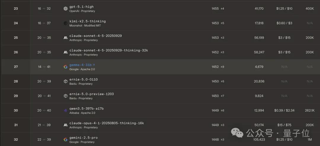 量子位 | 公众号 QbitAI31B开源模型,甩开比他大几十倍的模型,挤进竞技场开源前三。