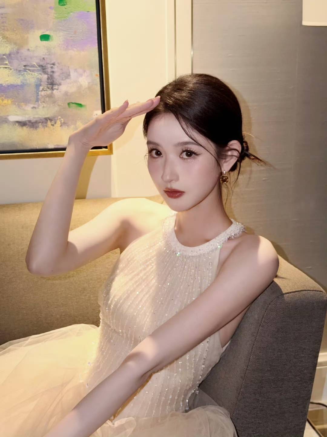 完全不走红毯博眼球的老套路,没有冗余装饰堆砌,没有夸张吸睛设计,仅凭一袭纯粹的纯白轻纱,就轻松赢麻全场。抹胸剪裁精准勾勒出她流畅优越的肩颈线条,天鹅颈配精致锁骨,体态舒展又挺拔。层层轻纱自带通透肌理,走动间裙摆扬起的弧度,像把春日流云与揉碎的月光都穿在了身上,细碎钉珠泛着低调柔光,不张扬却藏不住满溢的高级贵气。